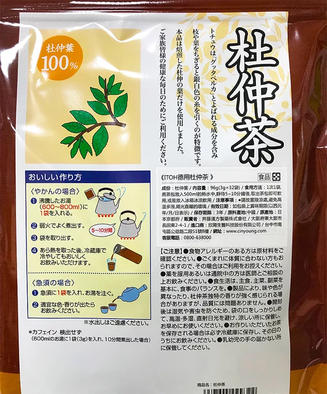‧護肝保腎 ‧降低中性脂肪、降血壓 ‧促進新陳代謝、熱量消耗、消脂 ‧通便利尿 ‧抗氧化、防衰老、美容養顏 ‧抗疲勞、強身健體、安神養眠 建議飲用:. 杜仲茶は、健康茶の中でも知名度が高いものの一つ。杜仲茶は様々な薬効成分があることで知られており、実際中国でも、かつては「不老長寿の薬」として珍重されていたと言われています。 杜仲茶の主な有効成分としては、 ・グッタペルカ ・アルカロイド. 1 茶包加入 1 杯熱水約250毫升.